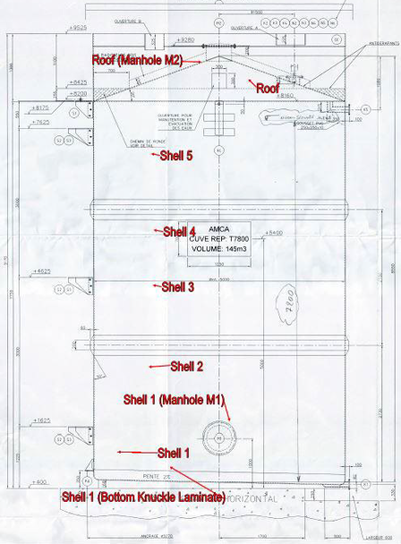 Tekniske data og serviceinformation: Overjordisk opbevaringstank med en diameter på 5000 mm og en højde på 8550 mm, konstrueret af glasfiberforstærket polyester med en 4 mm PVC-liner (termoplast). Tanken blev bygget i 2002 efter NF T-57900 standarden.